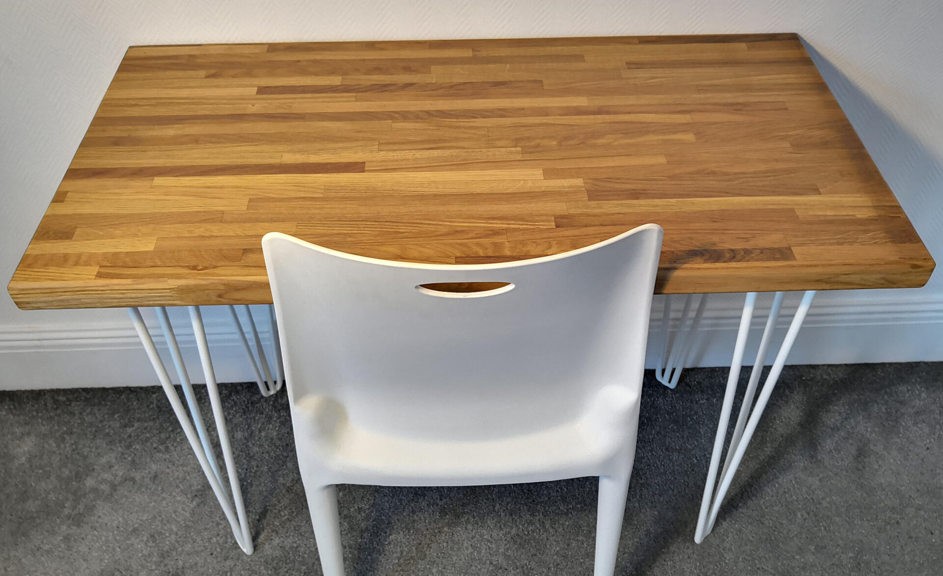 This beautiful oak desk was lovingly handmade in my Kent workshop; care has been taken in creating this sturdy item into the finished product shown. The oak was cut to size, the desktop's edges were all rounded off then the oak was sanded repeatedly using progressively finer sandpaper to give a pleasingly tactile feel. 6 separate coats of Ronseal Anti Bacterial Worktop Satin Oil finish were then applied (with light sanding between coats) to fully nourish the oak, enhancing the wood's natural beauty and providing some good protection during daily use.The hairpin legs were selected for this desk as, not only, are they incredibly strong but also a wonderfully simple design that does not detract from the natural beauty of the wood.In summary, this simply designed desk would be a wonderful enhancement to any home.