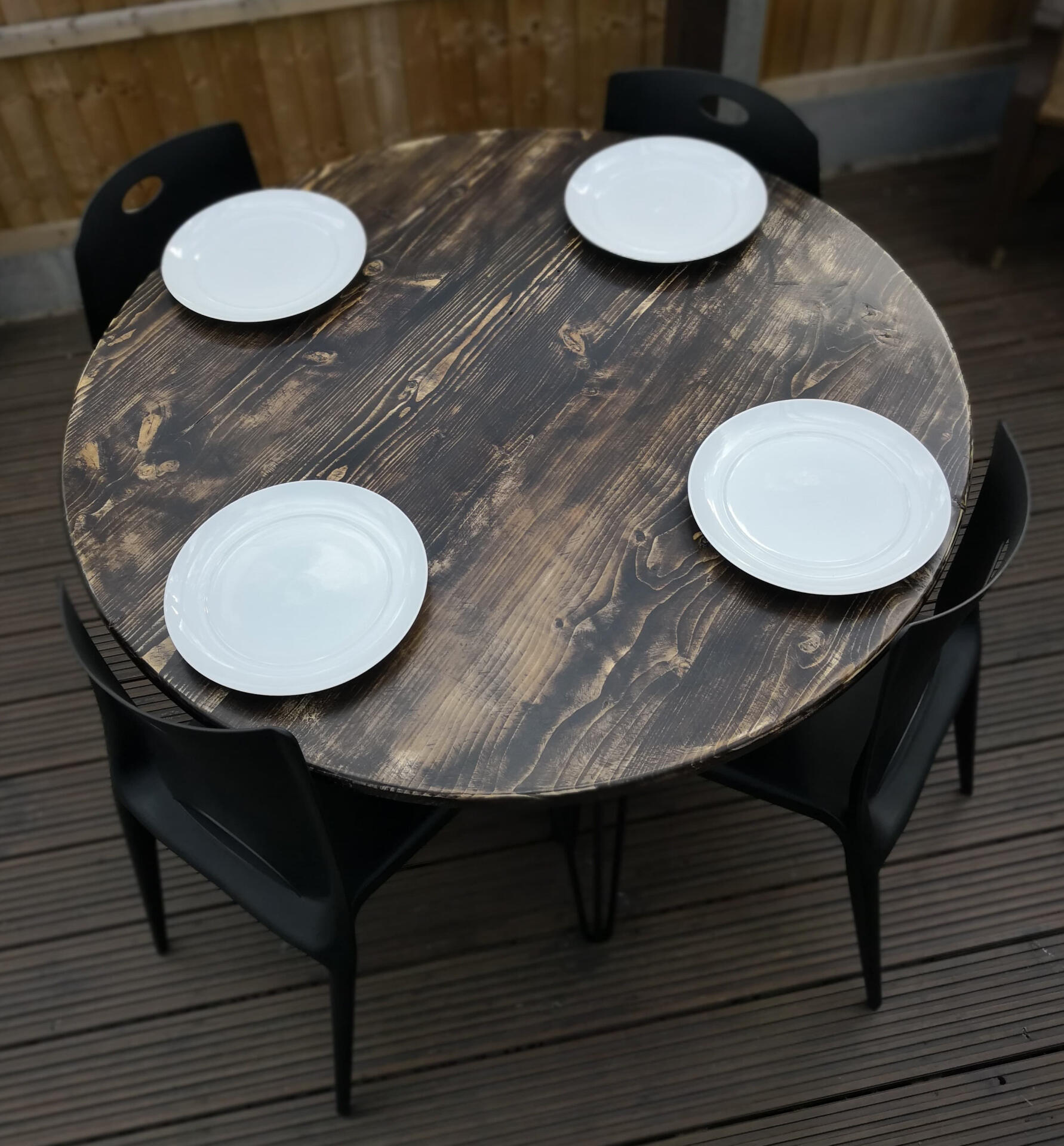This characterful, circular, 4-5 seat, reclaimed scaffold board dining table was lovingly handmade in my Kent workshop; care has been taken in creating this sturdy item into the finished product shown.The steel hairpin legs were selected for this dining table as, not only, are they easily able to support the weight of the table top but are also wonderfully simple in design; they do not detract from the beauty of the wood, by which I mean not only the wood grain but also the knocks and scrapes endured in its previous life.In summary, this has truly escaped its very humble beginnings.