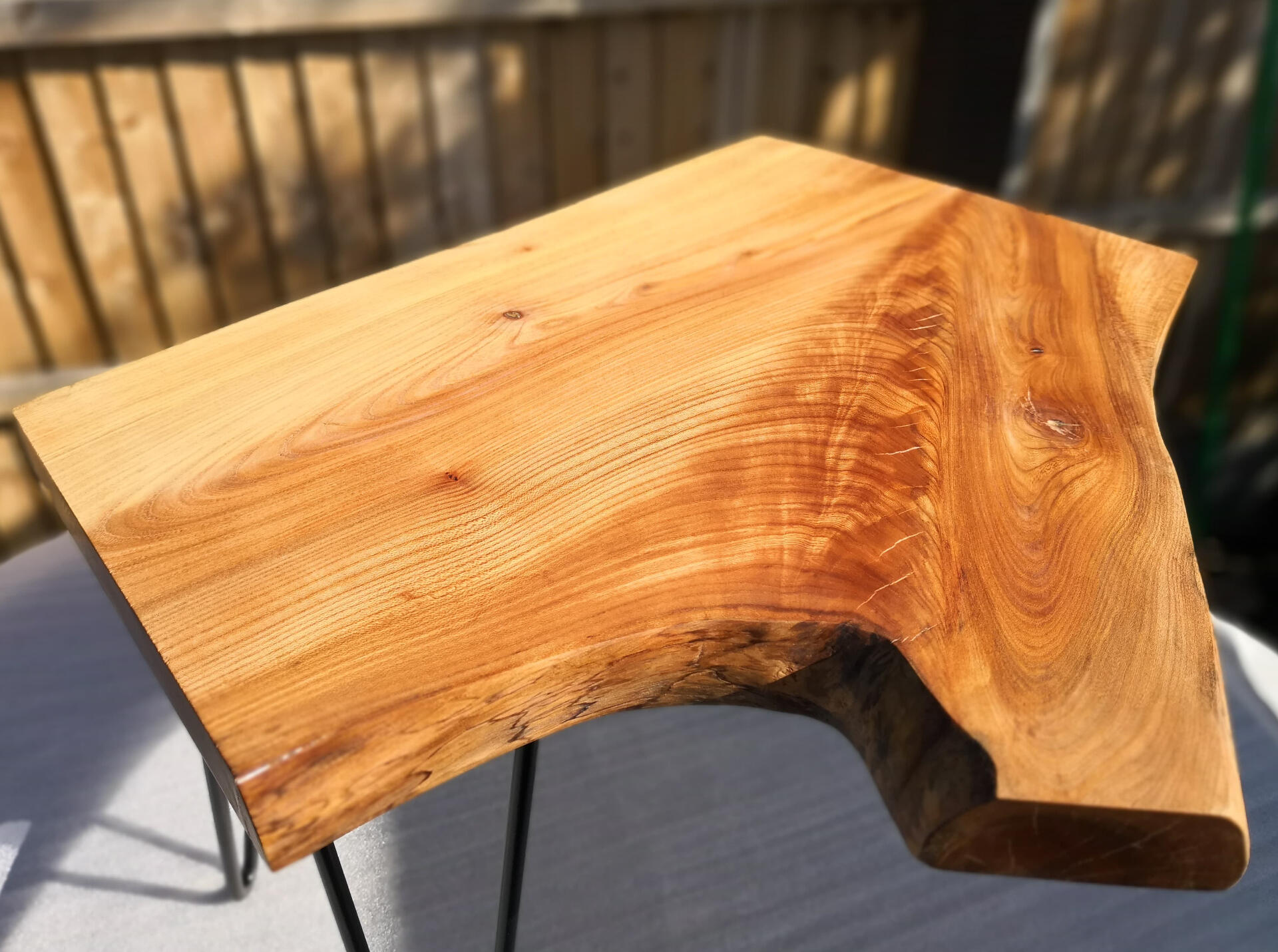 This unique, beautiful solid elm side/coffee table was lovingly handmade in my Kent workshop; care has been taken in creating this sturdy item into the finished product shown. The elm wood was carefully selected for its stunning grain pattern, once cut to size, the table top was machine planed both sides, any defects were filled then sanded repeatedly using progressively finer sandpaper to give a silky smooth feel. 6 separate coats of Ronseal Anti Bacterial Worktop Oil were then applied (with light sanding between coats) to fully nourish the elm, enhancing the wood's natural beauty and provide some protection during use.The hairpin legs were selected for this table as, not only, are they incredibly strong but also a wonderfully simple design that lets the elm be the "star of the show".In summary, this characterful table would be a truly stunning addition to any home.